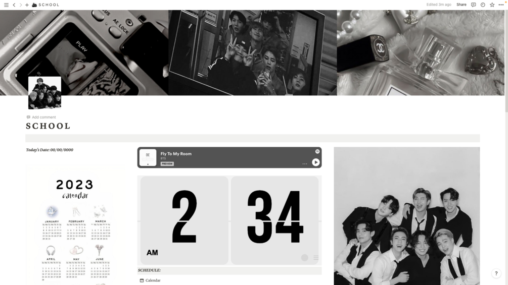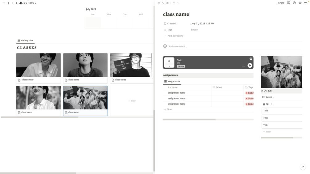 This notion template is inspired by the K-Pop group, "BTS." It includes an assignment tracker, notes tracker and music! Each page is designed to go along with each member. There are also calendars, songs, to do lists and more! The overall theme includes a color set of black and white. There are few slightly contrasting colors as well.