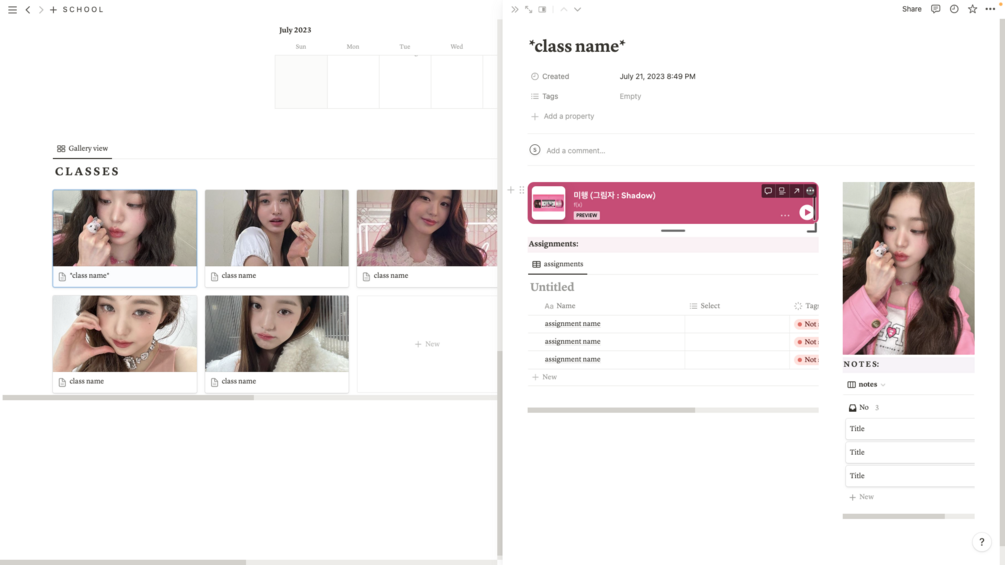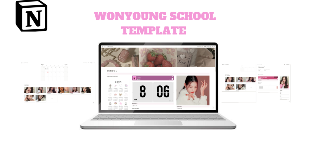 This template is inspired by the K-pop idol "Wonyoung." It includes an assignment tracker, notes tracker and music! There are also calendars, songs, to do lists and more! The overall theme includes a color set of pink, red and there are few slightly contrasting colors as well.